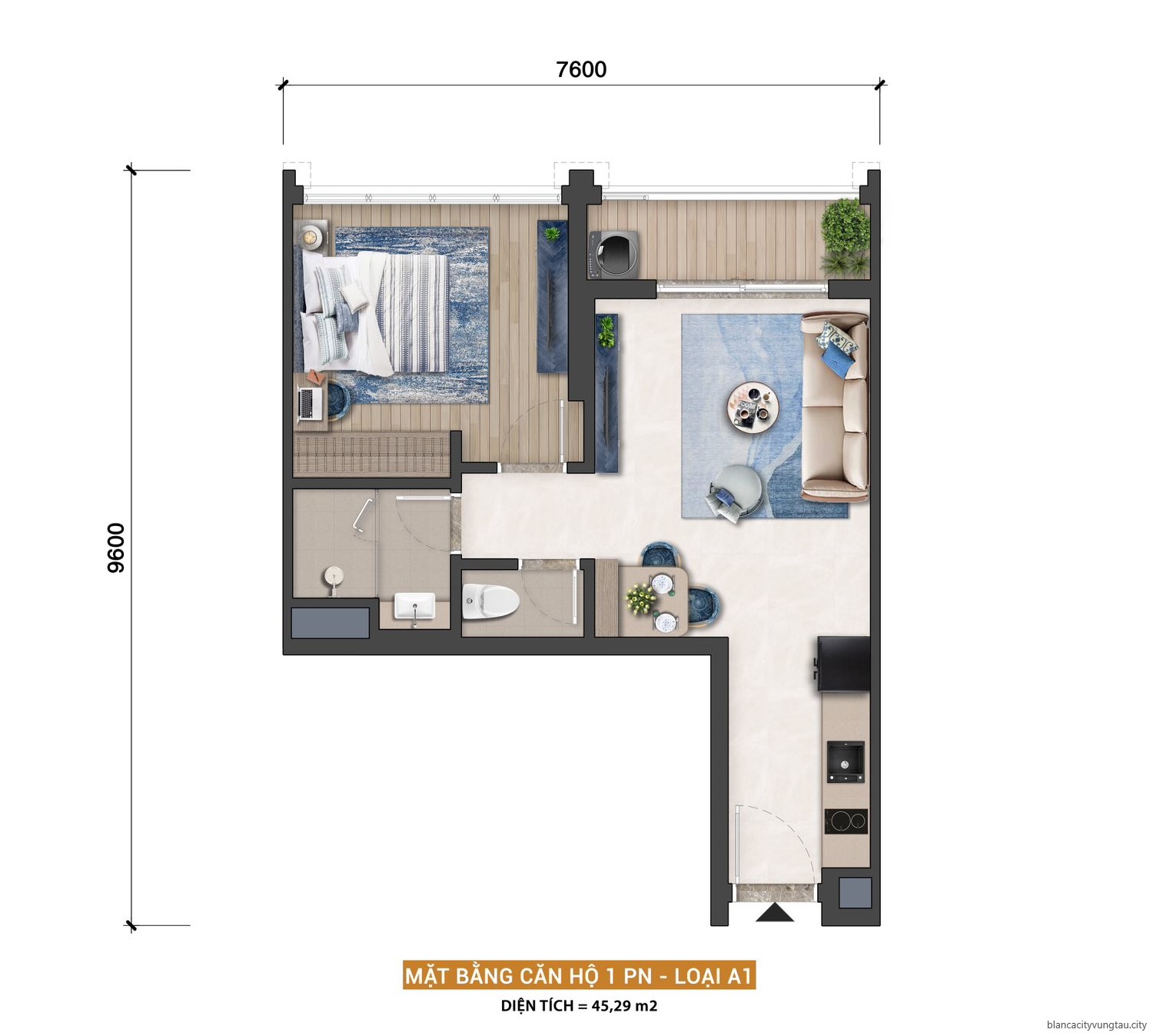 Thiết kế: Phòng khách liên thông bếp, 1 phòng ngủ riêng biệt, ban công thoáng, tối ưu ánh sáng và tầm nhìn biển, có loại 1PN+1 linh hoạt thêm không gian làm việc hoặc phòng ngủ phụ